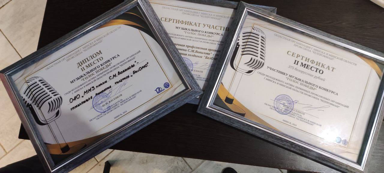 Cёння каманда нашага завода – Анастасія Анікеіч (пр-ць 54), Яна Карпава (аддзел 30) і Андрэй Логвін (аддзел 37) – заняла 2 месца на музычным конкурсе "Голас Перамогі" сярод маладзёжнага актыву пярвічных прафсаюзных арганізацый г. Мінска і Мінскай вобласці!